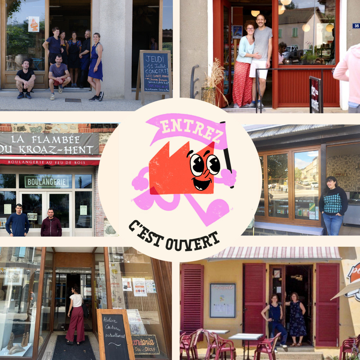La mission : créer un visuel amical pour la campagne "Entrez c'est ouvert" tout en respectant la charte graphique de Villages Vivants pour des stickers et affiches à coller sur les lieux ouverts grâce aux investisseur·ses.